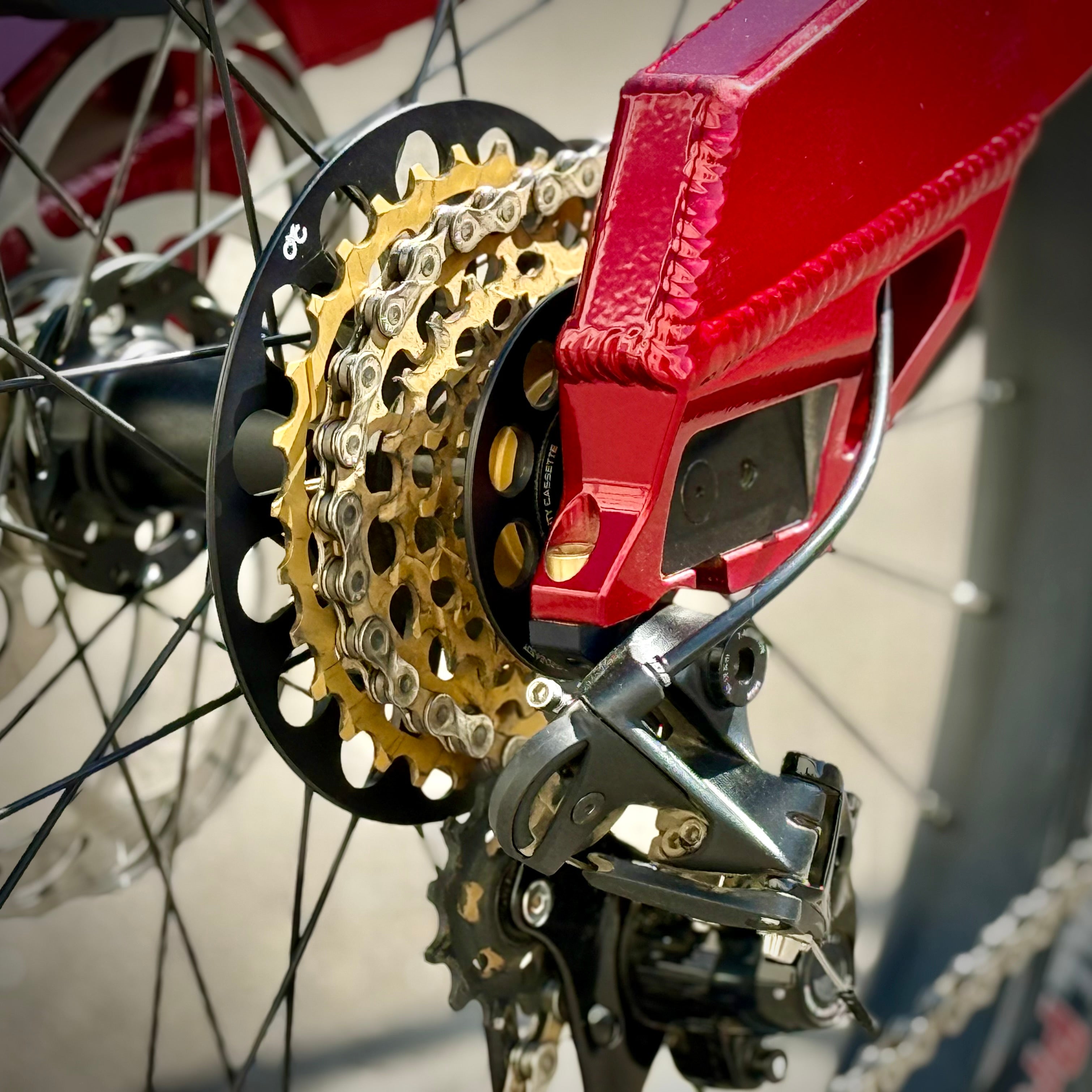 We have paired the Revolution MX with a completely custom drivetrain, capable of reliably handling all this power. A custom rear hub, custom 5 speed cassette, a high performance chain for high power, and custom derailleur system with integrated clutch make this perform as well as it look!